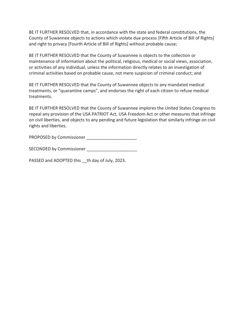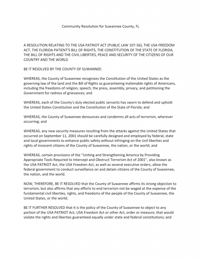American Patriots is currently working to encourage our surrounding counties to also pass this resolution. The current status of this effort is as follows: Lafayette County: PASSED, Hamilton County: PASSED, Columbia County: pending, Madison County: pending, Gilchrist County, pending.